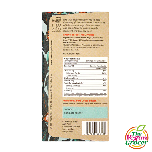 Theo & Philo 65% Dark Chocolate with Black Sesame, Cashew, and Pili Nut 45g