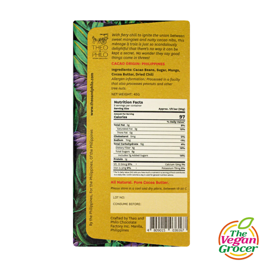 Theo & Philo 65% Dark Chocolate with Mango, Chili & Cacao Nibs 45g