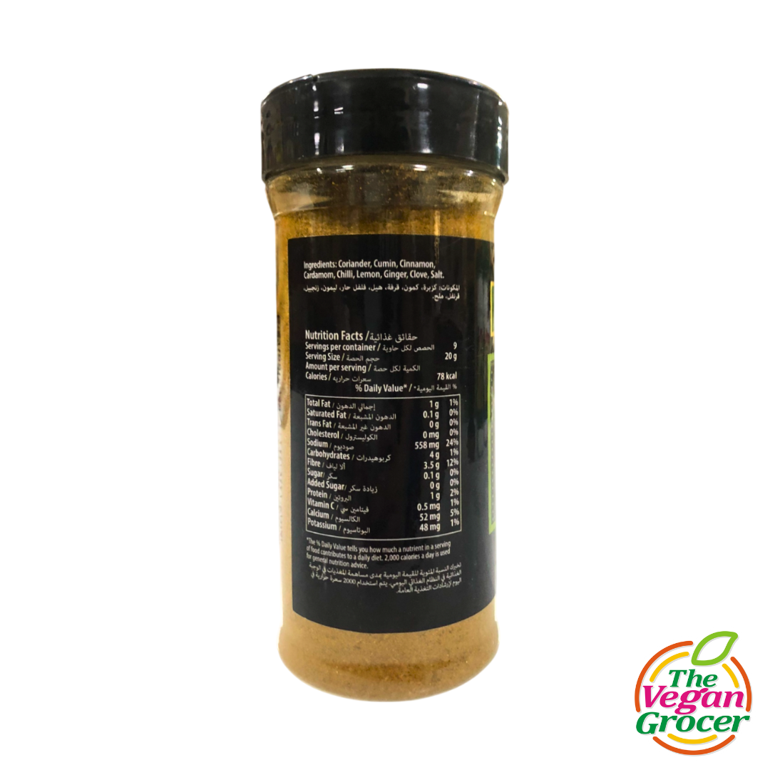 Coriander, Cumin, Cinnamon, Cardamom, Chili, Lemon, Ginger, Clove, Salt.