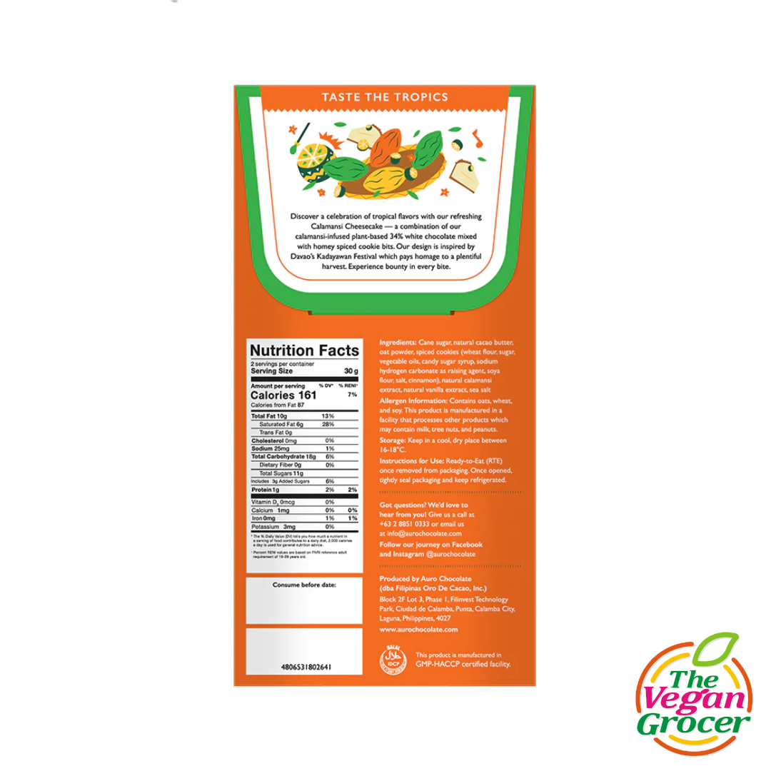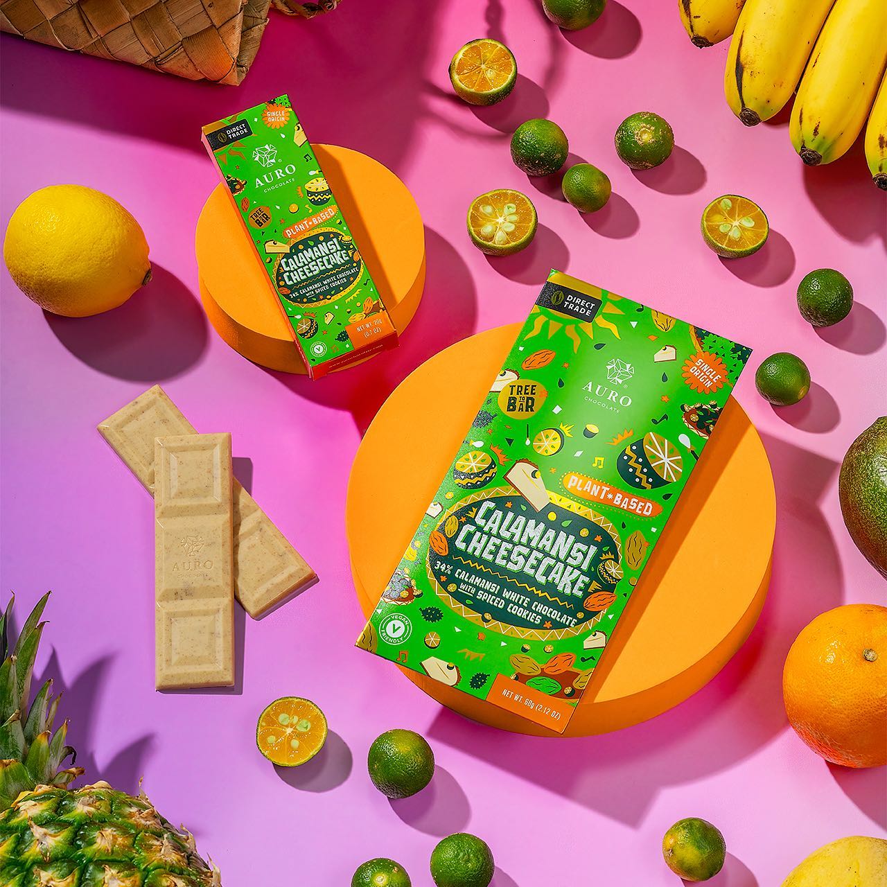 Discover a celebration of tropical with our refreshing Calamansi Cheesecake- a combination of our calamansi- infused plant-based 34% white chocolate mixed with homey spiced cookie bits. Our design is inspired by Davao's Kadayawan Festival which pays homage to a plentiful harvest. Experience bounty in every bite.