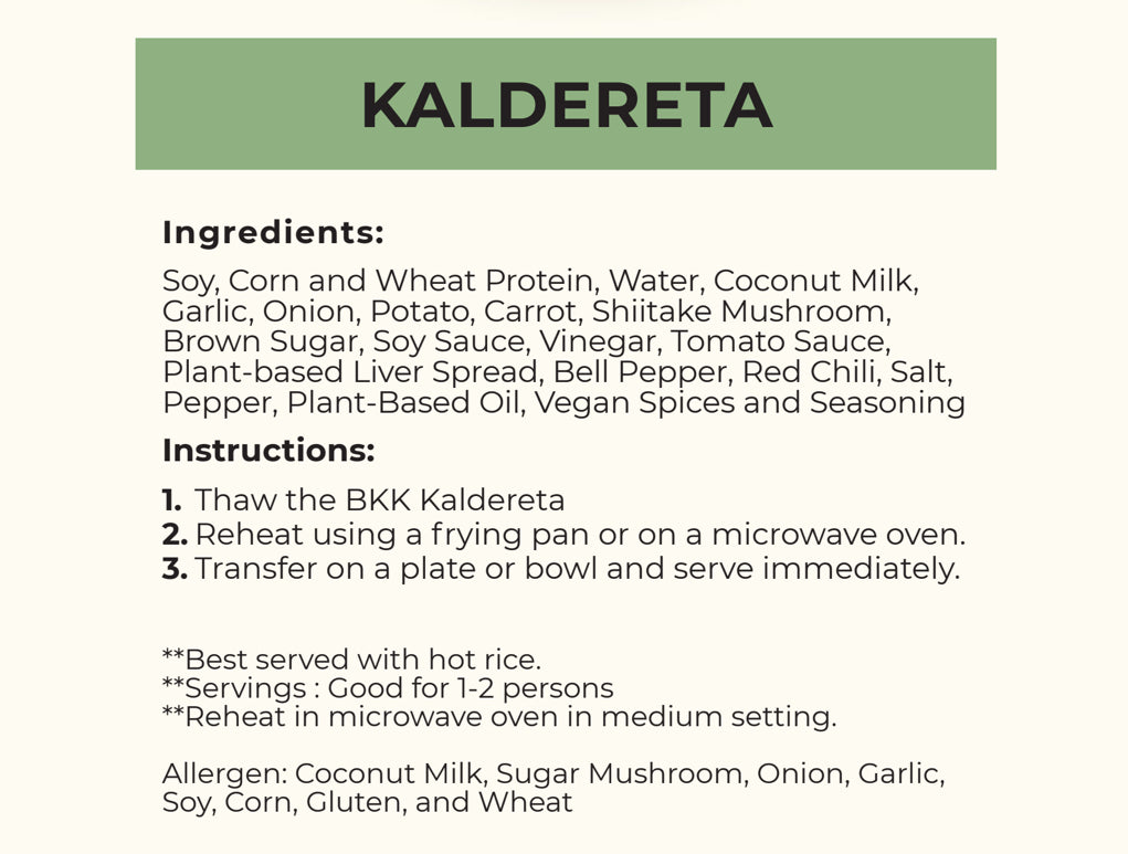 Soy, Corn and Wheat Protein, Water, Coconut Milk, Carlic, Onion, Potato, Carrot, Shiitake Mushroom, Brown Sugar, Soy Sauce, Vinegar, Tomato Sauce, Plant-based Liver Spread, Bell Pepper, Red Chill, Salt, Pepper, Plant-Based Oil, Vegan Spices and Seasoning