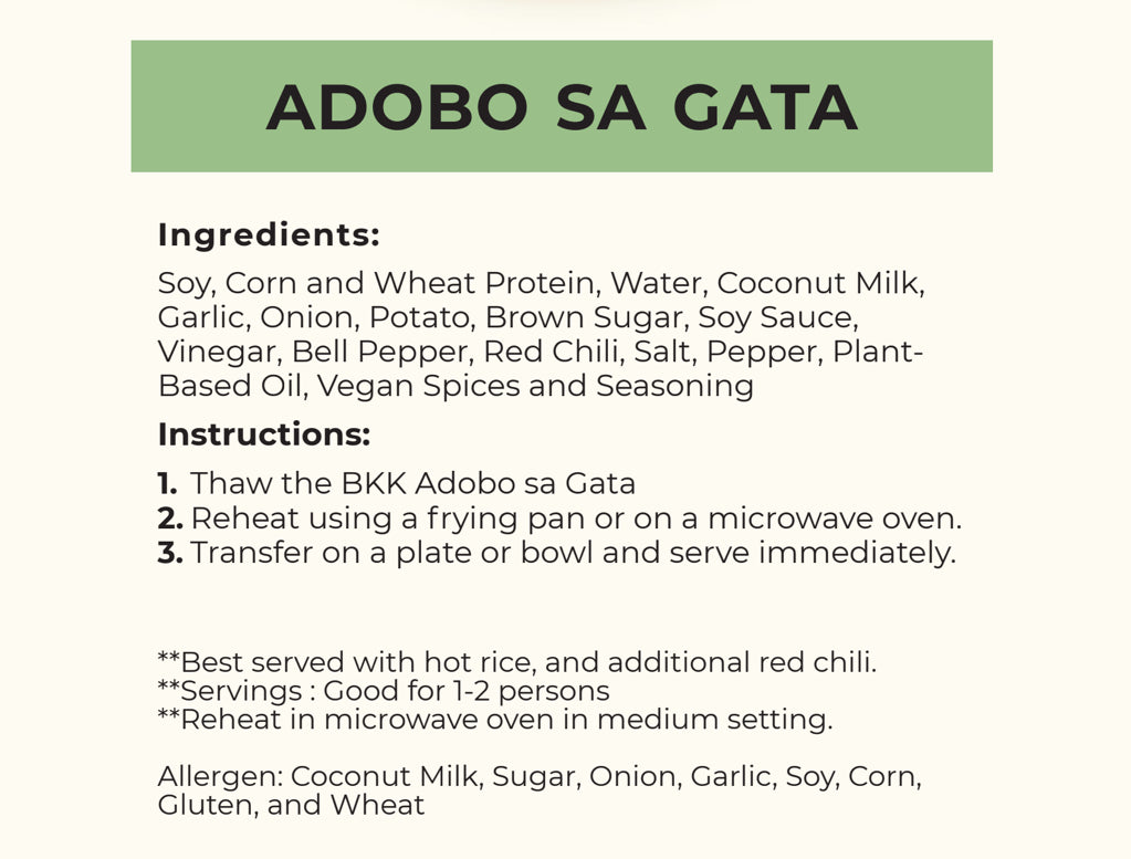 Soy, Corn and Wheat Protein, Water, Coconut Milk, Garlic, Onion, Potato, Brown Sugar, Soy Sauce, Vinegar, Bell Pepper, Red Chili, Salt, Pepper, Plant-Based Oil, Vegan Spices and Seasoning
