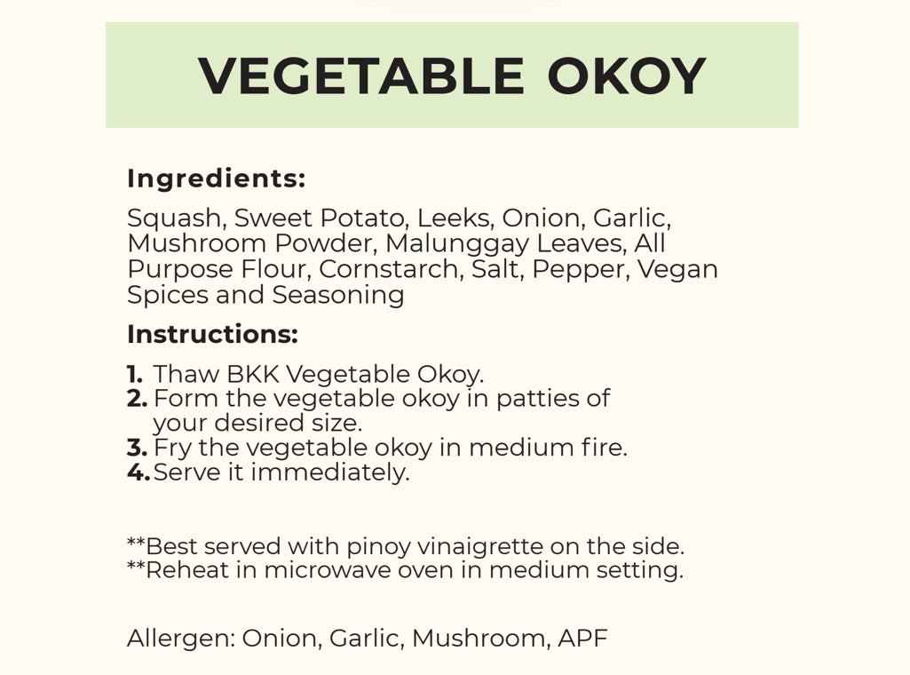 Squash, Sweet Potato, Leeks, Onion, Garlic, Mushroom Powder, Malunggay Leaves, All Purpose Flour, Cornstarch, Salt, Pepper, Vegan Spices and Seasoning