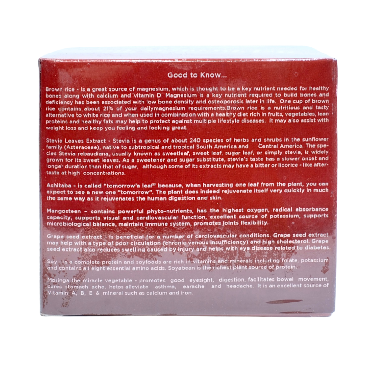 INGREDIENTS: Brown rice coffee, Stevia natural sweetener, Ashitaba extract powder, Mangosteen extract powder, Grape seed extract powder, Soya extract powder, Moringa leaves powder, Non-dairy creamer