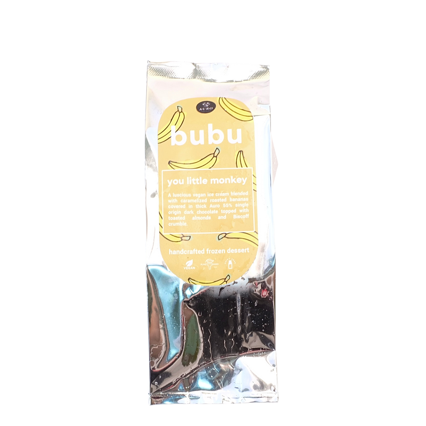 A luscious vegan ice cream blended with caramelized roasted bananas covered in thick Auro 55% single origin dark chocolate topped with toasted almonds and Biscoff crumble.