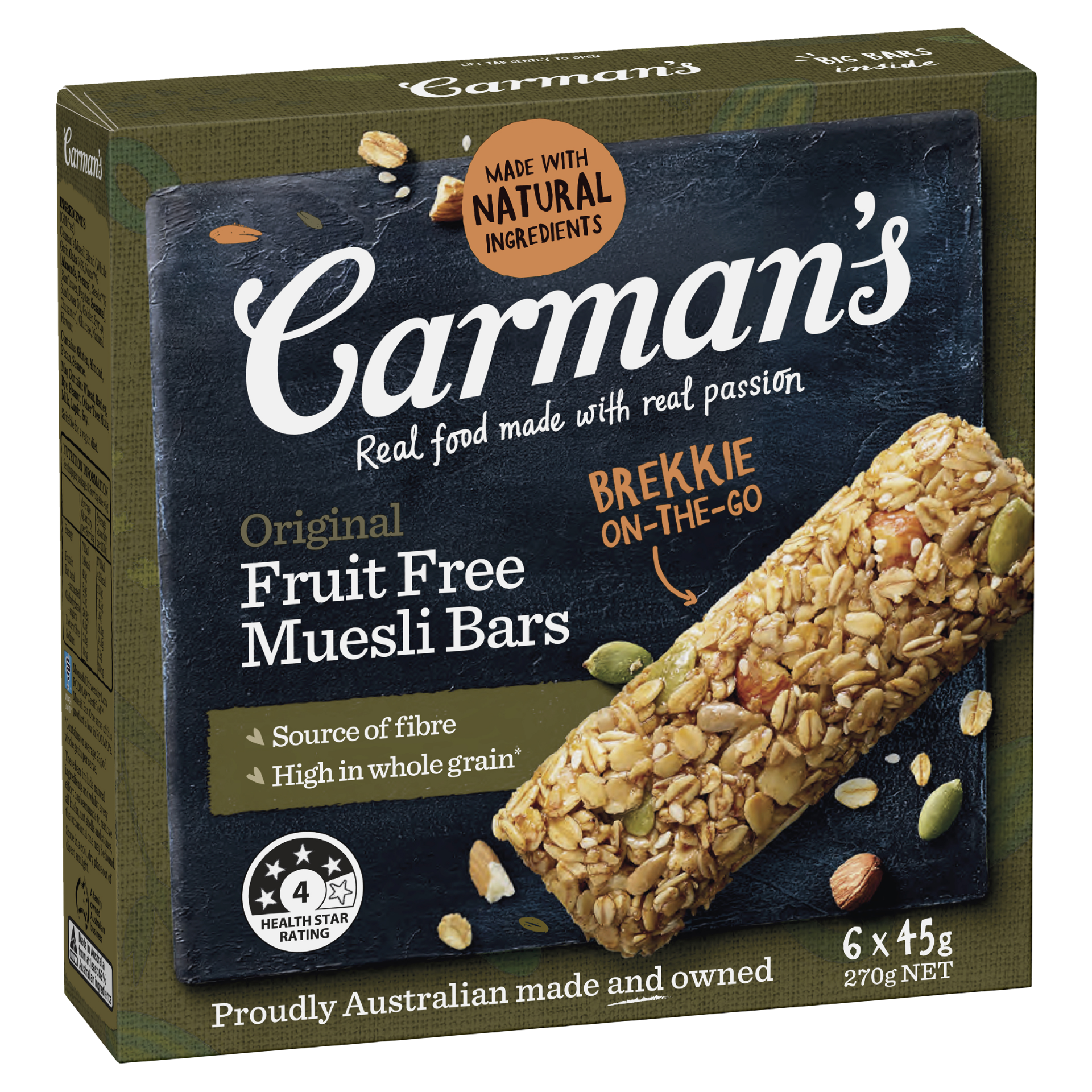Original Fruit Free Muesli Bars from Carman's. Chock full of wholegrain oats, crunchy nuts, wholesome seeds and cinnamon.