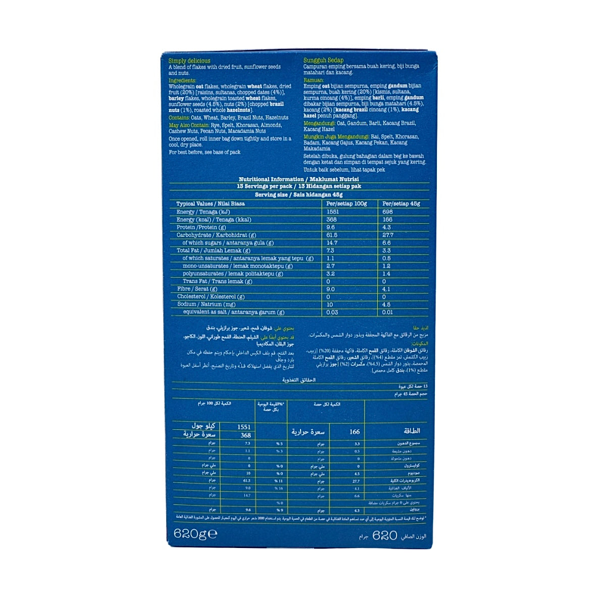 Wholegrain oat flakes, wholegrain wheat flakes, dried fruit (20%) [raisins, sultanas, chopped dates (4%)], barley flakes, wholegrain toasted wheat flakes, sunflower seeds (4.5%), nuts (2%) [ chopped brazil nuts (1%), roated whole hazelnuts].