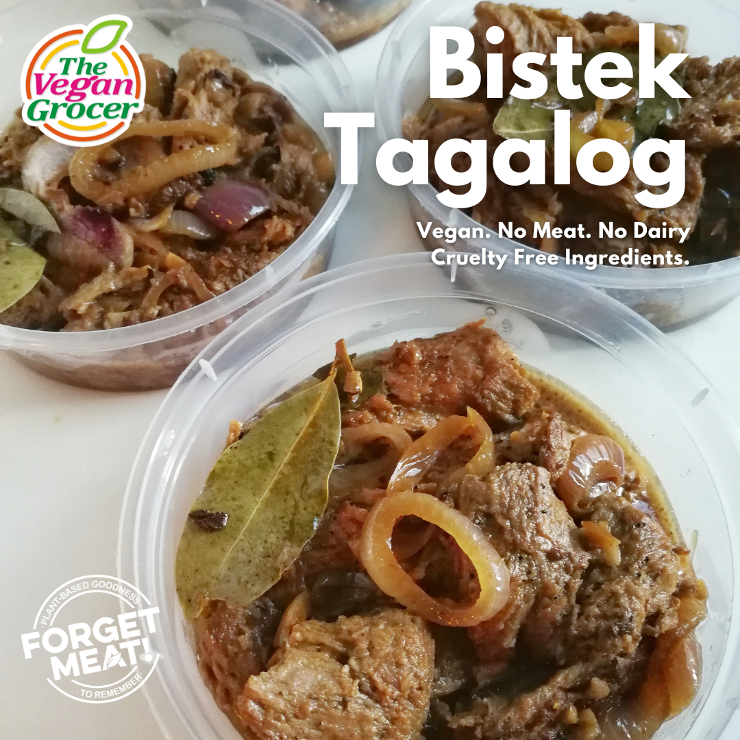 A vegan version of bistek, with veggie meat marinated in soy sauce, calamansi, and garlic, then cooked to perfection with onions and bay leaves.