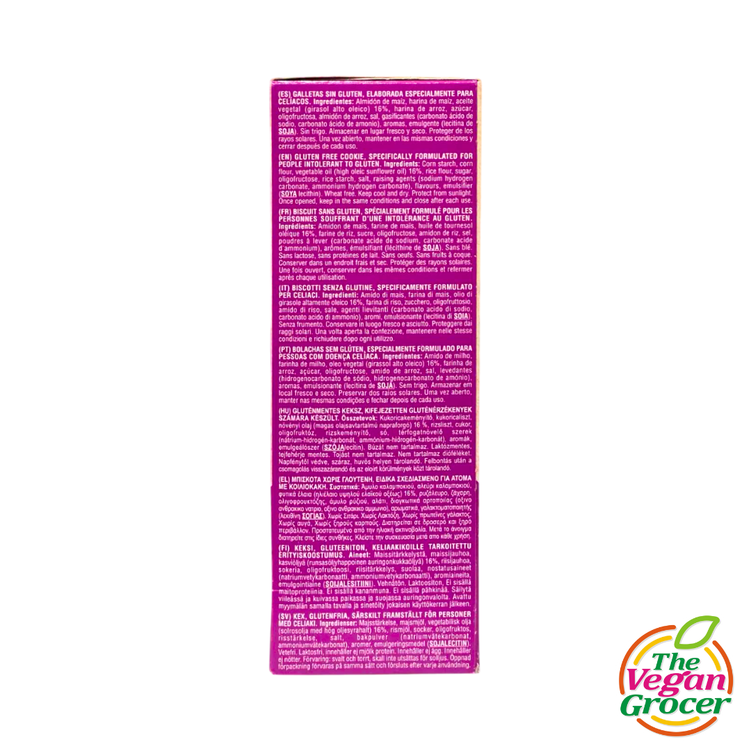INGREDIENTS: Corn Starch, Corn Flour, Vegetable Oil (high oleic sunflower oil) 16%, rice flour, sugar, oligofructose, rice starch, salt, raising agents (sodium hydrogen carbonate, ammonium hydrogen carbonate), flavors, emulsifier (SOYA lecithin). Wheat free.