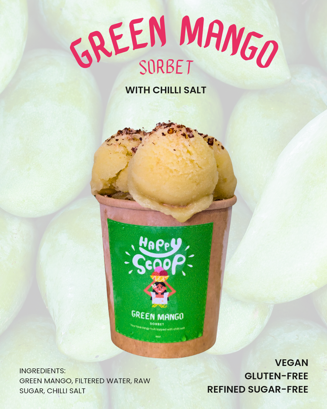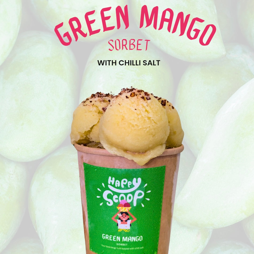 Indulge in a unique and flavorful experience with our Happy Scoop Green Mango Sorbet! This gluten-free treat is sprinkled with chili salt for an irresistible burst of flavor. A must-try for any sorbet lover!