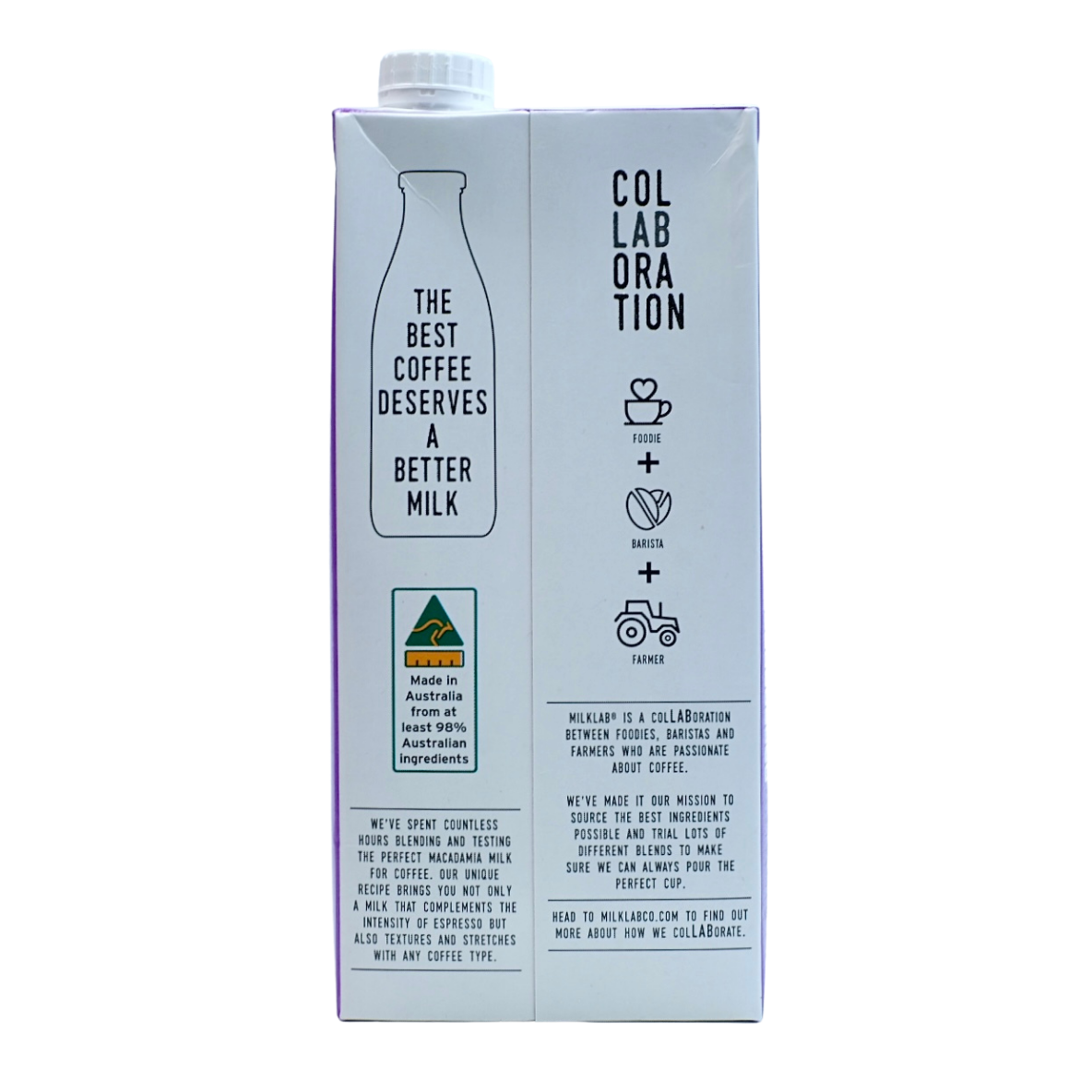 Milk Lab spent countless hours blending and testing the perfect macadamia milk for coffee. Milk Lab's unique recipe brings you not only a milk that compliments the intensity of espresso but also textures and stretches with any coffee type.