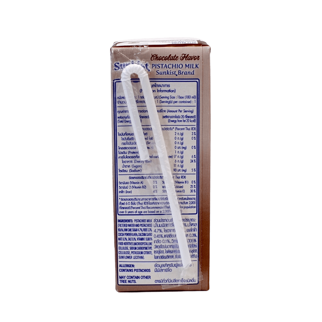Pistachios milk (filtered water and pistachios) 90.6%, raw cane sugar 4.7%, fiber 3.3%, cocoa powder 0.45%, calcium carbonate 0.3%, salt 0.1%, vitamin e 0.005% food additives (microcrystalline cellulose, sodium carboxymethyl cellulose, potassium citrate, sunflower lecithin).