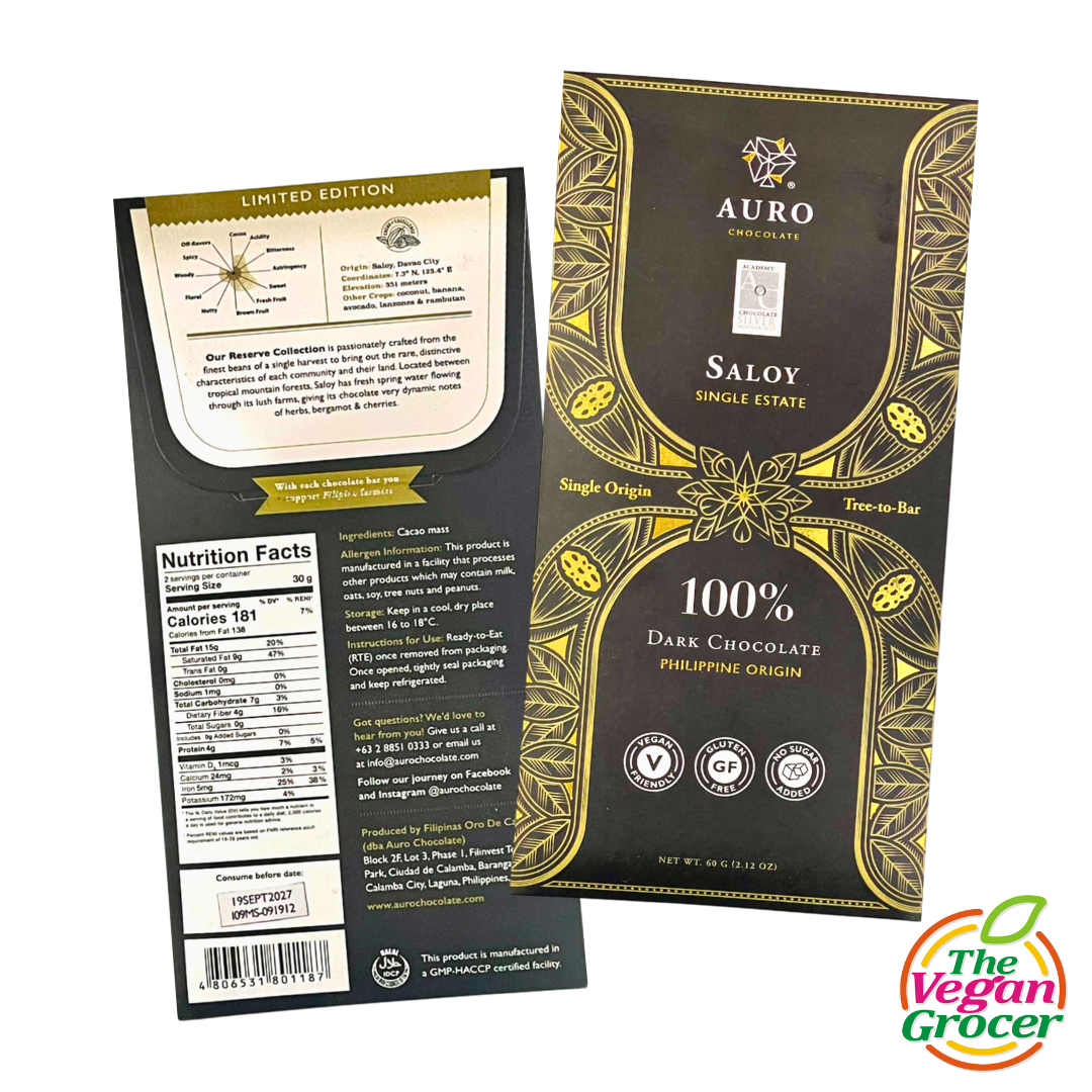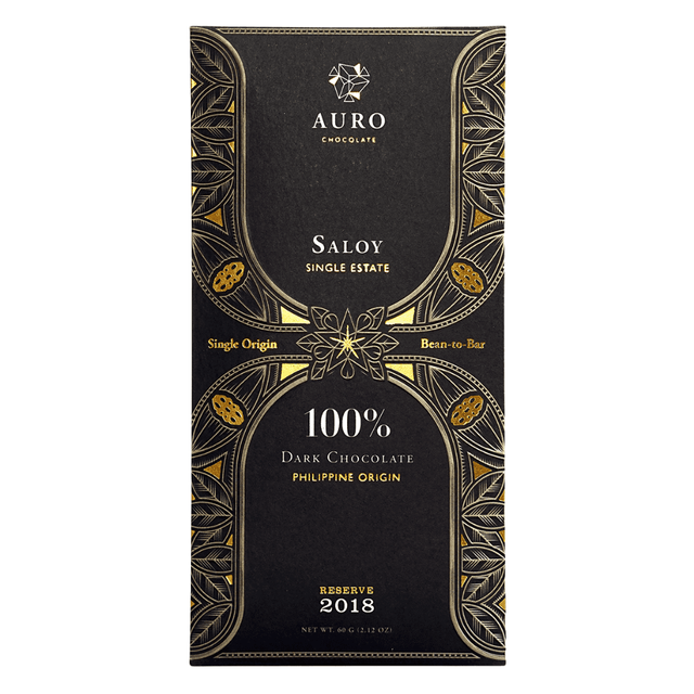 `Discover our 100% natural, Reserve Collection by Auro 100% Saloy Dark Chocolate is made from quality cacao beans sourced directly from Davao farmers; perfect for your cravings and all your culinary needs.