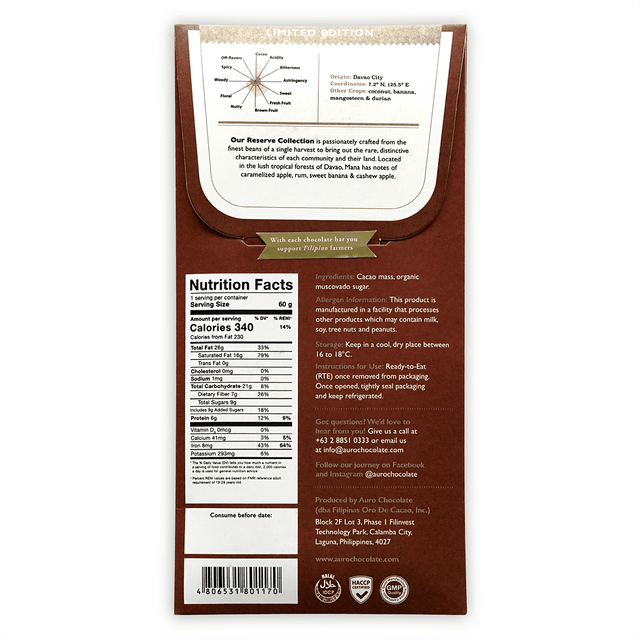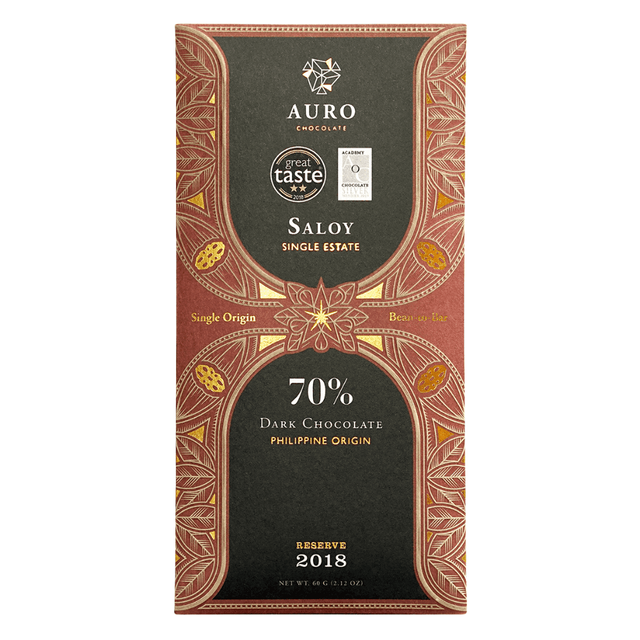 ` Discover our 100% natural, Reserve Collection by Auro 70% Saloy Dark Chocolate is made from quality cacao beans sourced directly from Davao farmers; perfect for your cravings and all your culinary needs.
