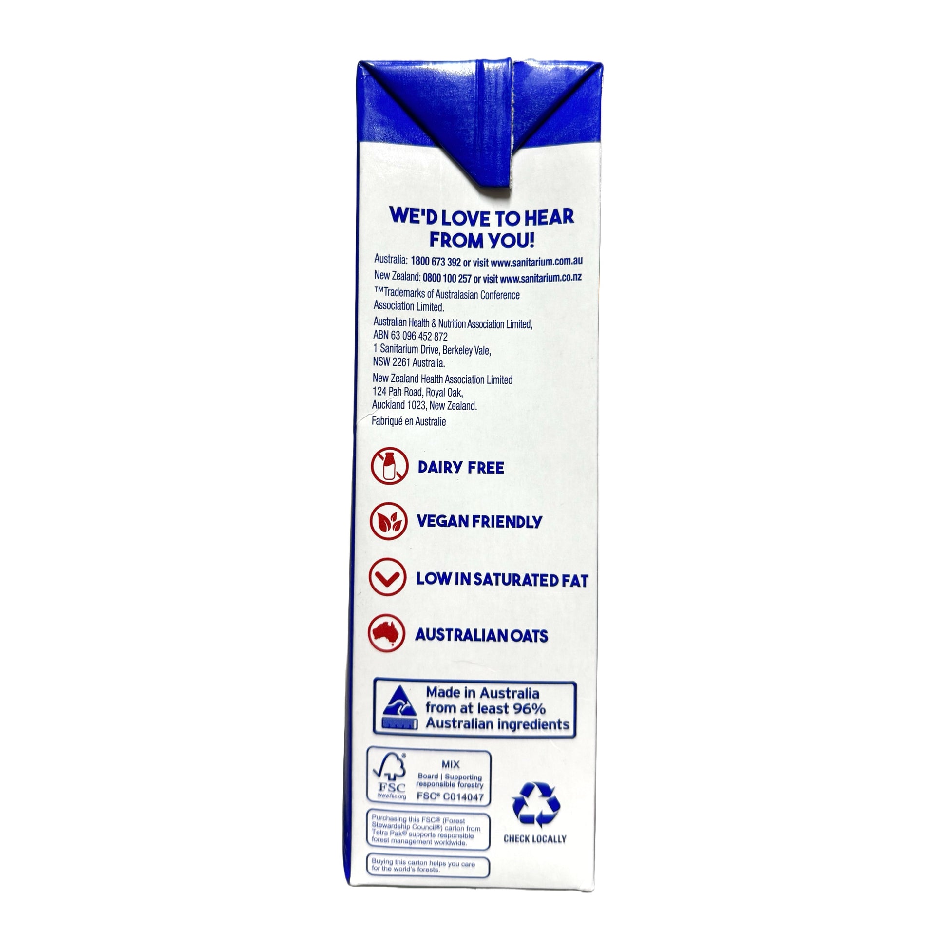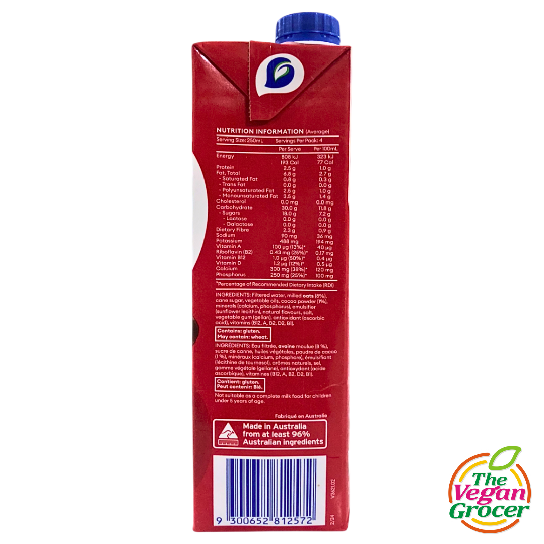 Filtered water, milled oats (8%), cane sugar, vegetable oils, cocoa powder (1%), minerals (calcium, phosphorus), emulsifier (sunflower lecithin), natural flavours, salt, vegetable gum (gellan), antioxidant (ascorbic acid), vitamins (B12, A, B2, D2, B1).