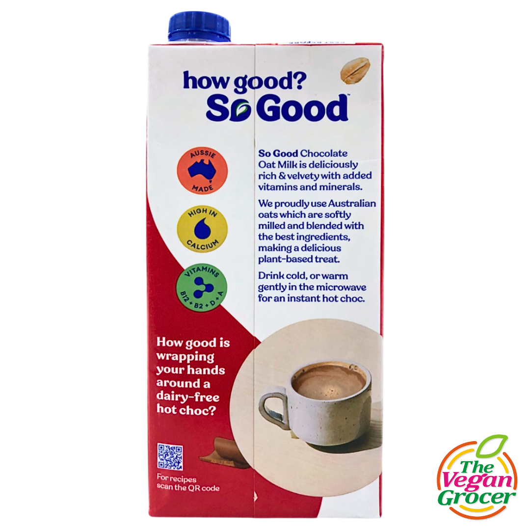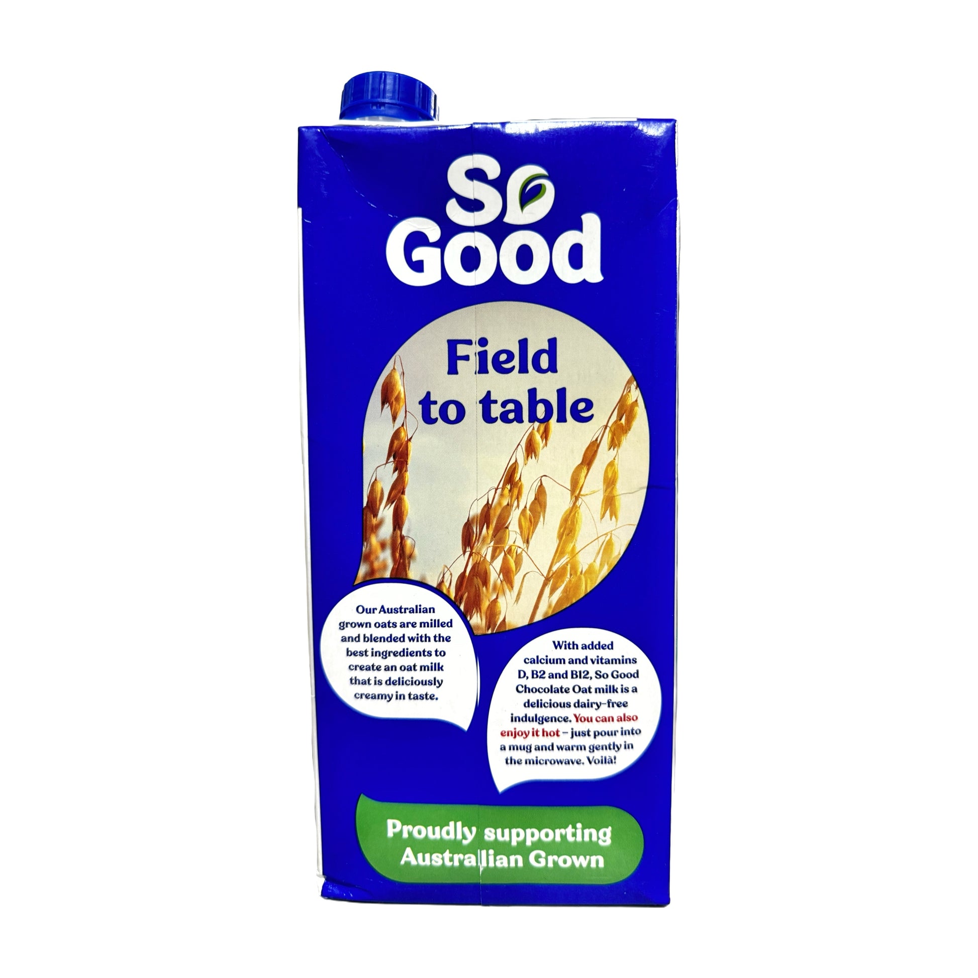 So Good™ Chocolate Oat Milk is deliciously rich & velvety with added vitamins and minerals. It’s also high in calcium and low in saturated fat. Drink cold, or warm gently in the microwave for an instant hot choc.