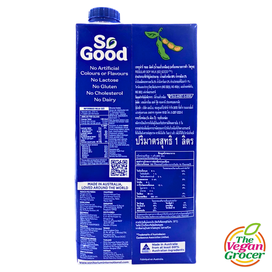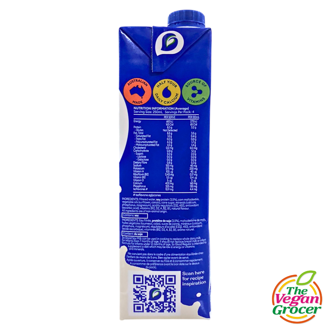 So Good Regular soy milk is a nutritious and delicious creamy milk. With protein and essential minerals, it’s naturally lactose and cholesterol free. And now with the added benefit of half your daily calcium and vitamin D in one glass, So Good Regular really is the milk for your body and your life.