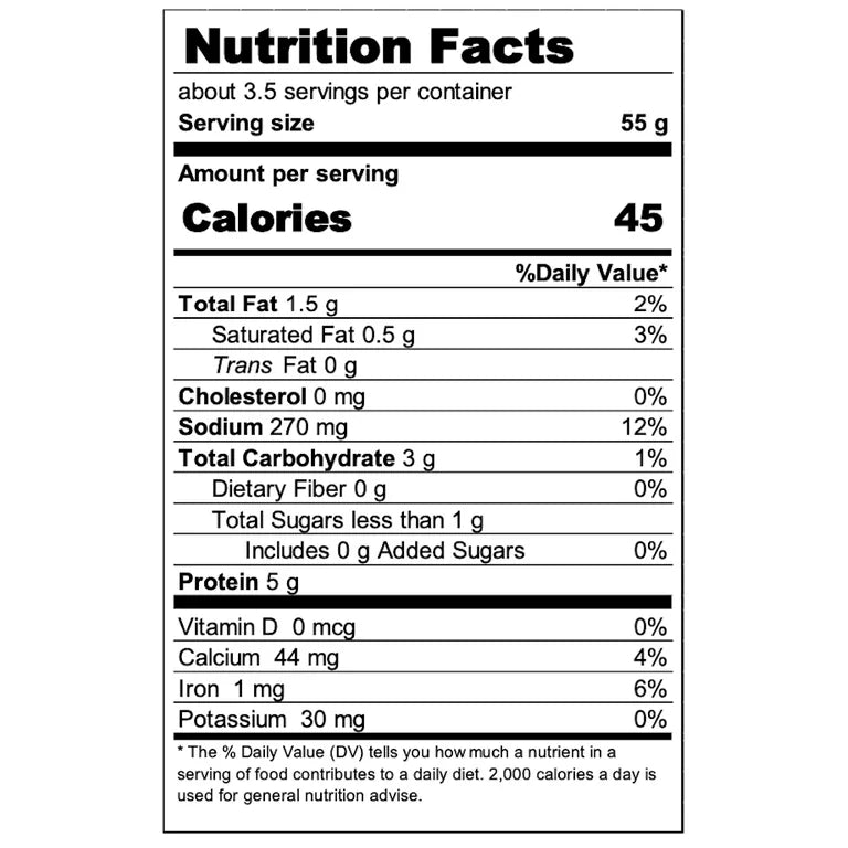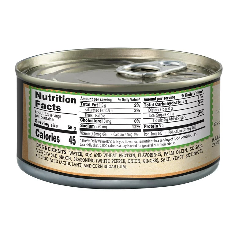 Water, Soy and Wheat Protein, Flavorings, Palm Olein, Sugar, Vegetable Broth, Seasoning (White Pepper, Onion, Ginger), Salt, Yeast Extract, Citric Acid (Acidulant) and Corn Sugar Gum