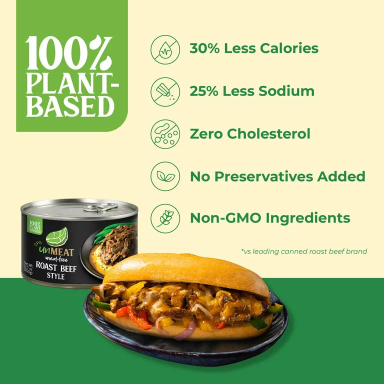 Meaty, tender roast beef in gravy made with plants. You'll be glad you skipped the beef with our hearty meal in a can that heats up in minutes. Made with non-GMO ingredients and 26 grams of protein per can, but without the bad stuff like cholesterol and added preservatives. Pair us with mashed potatoes, in a sandwich, or your next stroganoff!