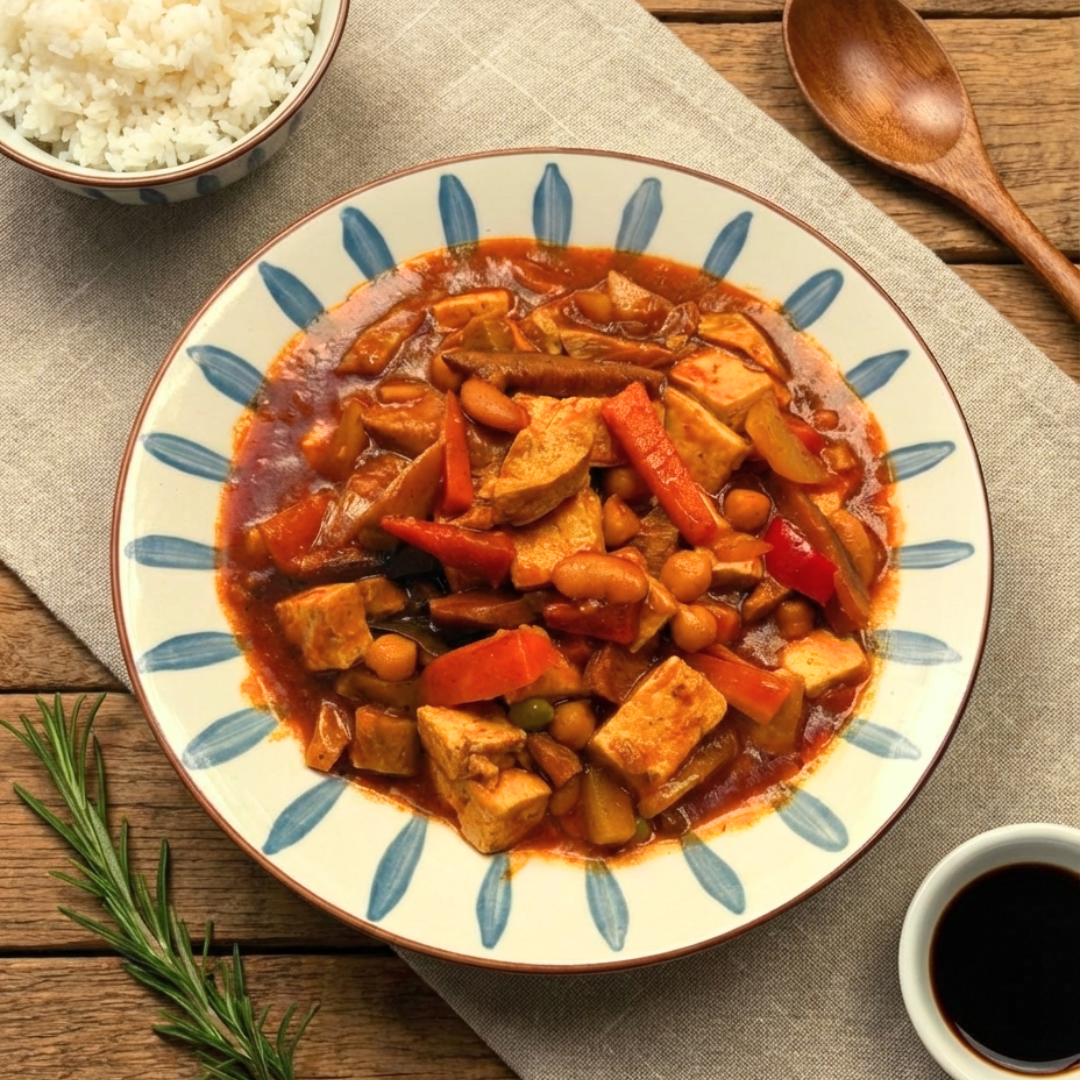Gluten, Tofu, Soy Sauce, Vinegar, Muscovado Sugar, Fresh Vegetables, and Mushrooms.